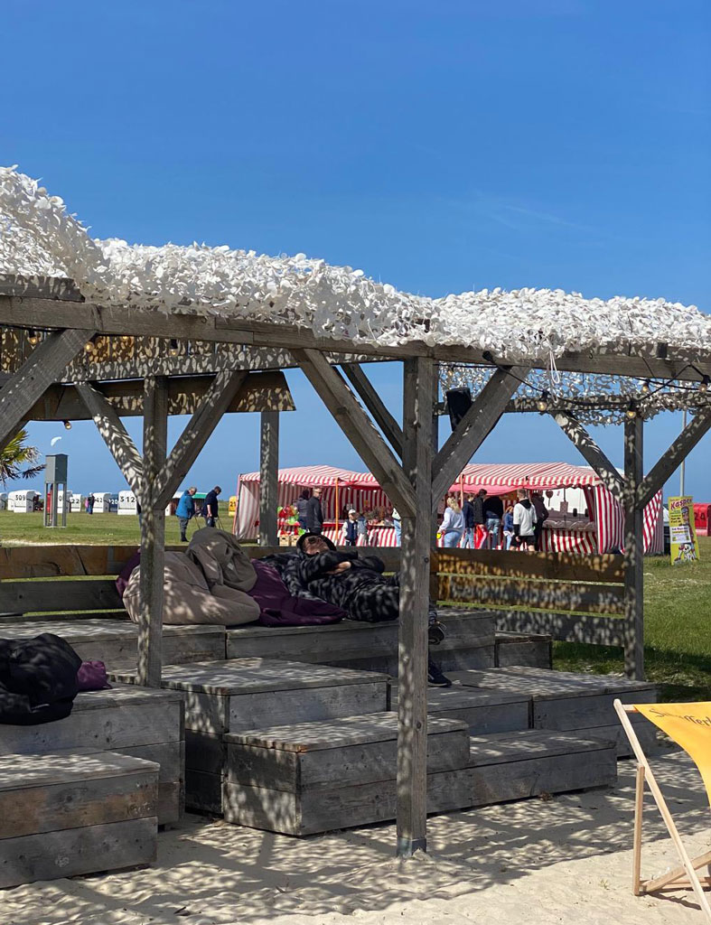 Die Lage auf der Schilliger Düne macht das 8 Grad Ost auch für Familien attraktiv. Direkt gegenüber liegt der große Spielplatz auf dem Campingplatz Schillig, sodass Eltern entspannt Cocktails genießen können, während die Kinder sicher spielen. Liegestühle und Loungemöbel am Strand laden zum Lümmeln ein – Füße im Sand, ein kühler Drink in der Hand, das ist pure Entschleunigung.