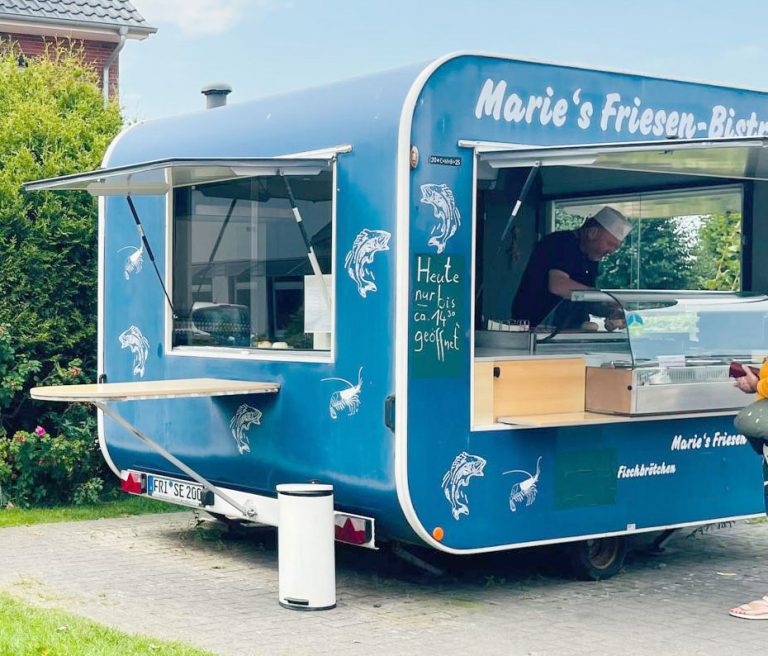 Wenn du in einer der Ferienwohnungen von Fewo Schillig wohnst, hast du es besonders gut: In nur zwei Minuten bist du bei Marie´s Friesen-Bistro und kannst dir ein leckeres Matjesbrötchen holen. Die Öffnungszeiten sind flexibel und werden täglich auf der kleinen Tafel am Wagen angeschrieben. Das macht den Besuch spontan und unkompliziert. Viele Dauercamper vom Campingplatz Schillig schätzen Gerald und seine Fischbude seit Jahren – ein echtes Stück Gemeinschaft und Nordseeküste zum Anfassen.
